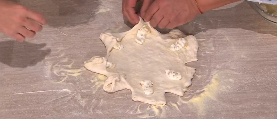 Stendiamo con le mani ciascun panetto, creando un disco sottile anche sui bordi (senza cornicione). Con una spatola, pratichiamo 7 tagli sui bordi. Su ogni raggio, mettiamo la ricotta lavorata a crema e condita con scorza caramellata di yuzu (o limone) tritata. Ripieghiamo l’impasto sulla ricotta, creando i raggi (foto).