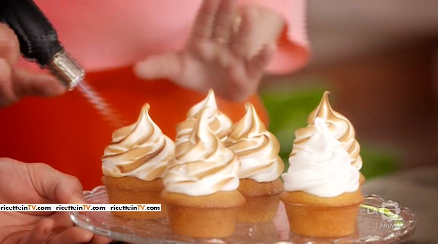 Formiamo sui cupcakes freddi dei ciuffi di meringa. Doriamo la meringa, fiammeggiandola con un cannello.