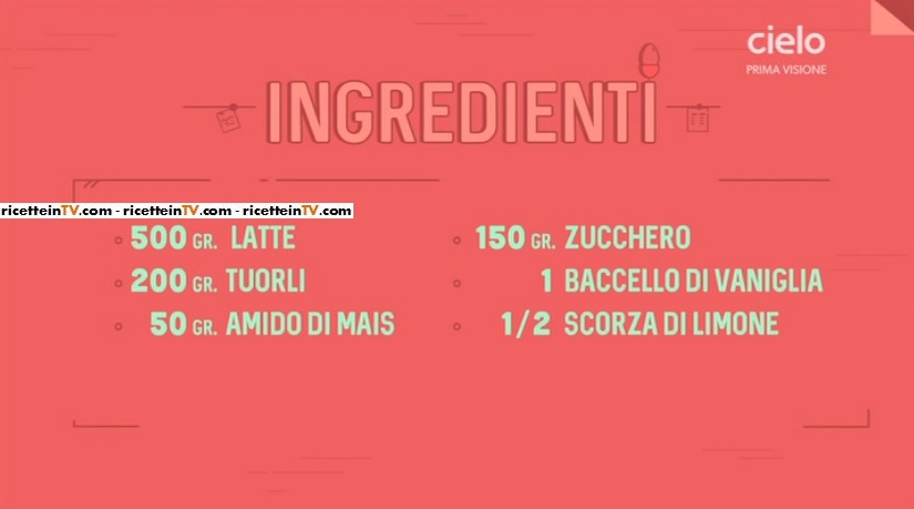 - 500 g latte, 200 g tuorli, 50 g amido di mais, 150 g zucchero, 1 baccello di vaniglia, 1/2 scorza di limone