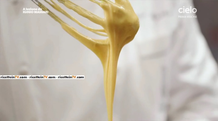 Quando il latte bolle, lo filtriamo e lo uniamo, in due volte, alla miscela di uova e amido, mescolando ogni volta; rimettiamo la miscela nella pentola e cuociamo, continuando a mescolare, a fuoco allegro. Quando la crema assume una consistenza setosa (quindi è sotto i 67°), la togliamo dal fuoco e la versiamo immediatamente in un contenitore che Massari consiglia di raffreddare in frigorifero o meglio in freezer; mescoliamo in modo da raffreddare la crema, portandola sotto i 50°. Cospargiamo tutta la superficie con zucchero semolato (attira a sè l’acqua, bagna la superficie e la crema non fa la crosta), oppure copriamo con della pellicola alimentare a contatto, e lasciamo raffreddare in frigorifero per almeno 5 minuti. Prima di utilizzarla, la mescoliamo con una frusta.