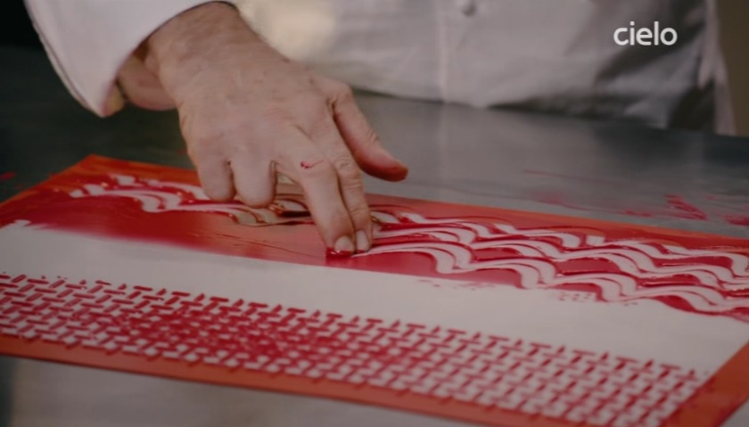 Su un tappeto di silicone o sun foglio di carta forno, spalmiamo parte della pasta sigaretta. Con due dita, quindi, disegniamo sull’impasto delle onde (foto). Trasferiamo il tappertino o foglio di carta forno su una teglia e mettiamo in freezer a congelare.