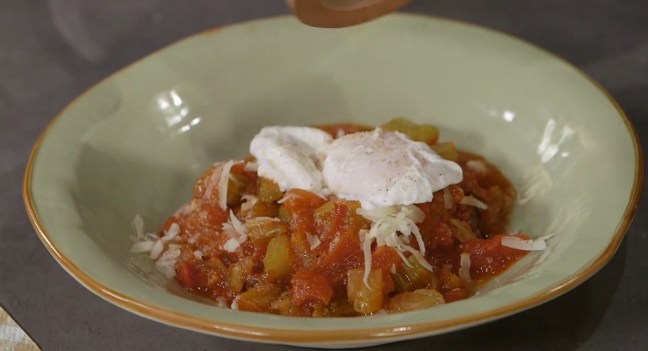 Serviamo l’uovo sui pomodori cotti e finiamo con il pecorino grattugiato ed i crostini di pane