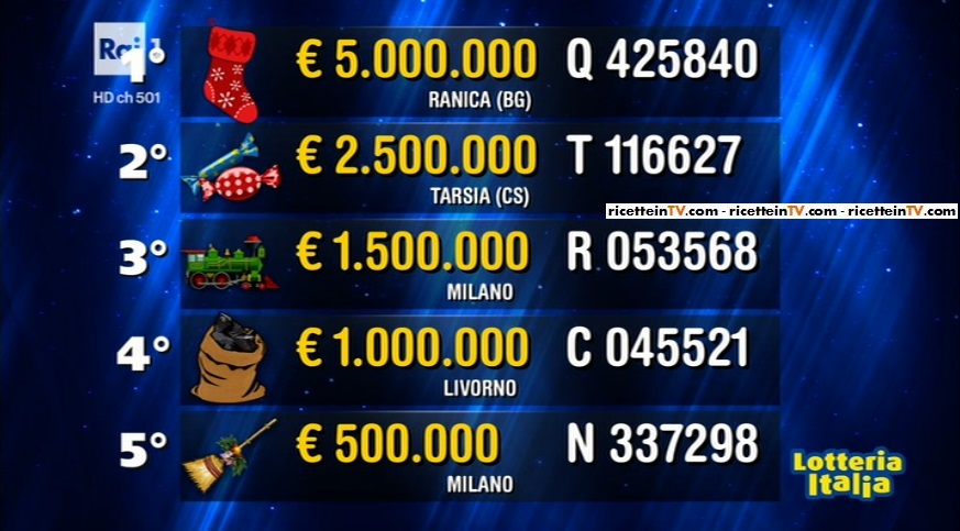 I premi principali, di ‘prima categoria‘, saranno sorteggiati questa sera, nel corso della puntata speciale di Affari tuoi, e prevedono un primo premio di 5milioni di euro. Nel corso della puntata speciale di Affari tuoi, innumerevoli ospiti festeggeranno come da tradizione, l’arrivo della Befana supermilionaria: Margherita Buy, Loretta Goggi, Daniela Goggi, Paolo Fox, Daniele Liotti, Elena Sofia Ricci, Simone Montedoro, Tullio Solenghi, Massimo Lopez, Iva Zanicchi, Max Tortora, Laura Barriales, Sergio Friscia, Nino D’Angelo, Gloria Guida, Tiberio Timperi, Alberto Matano, Riccardo Polizzy Carbonelli, Edoardo Vianello e i Ricchi e Poveri.