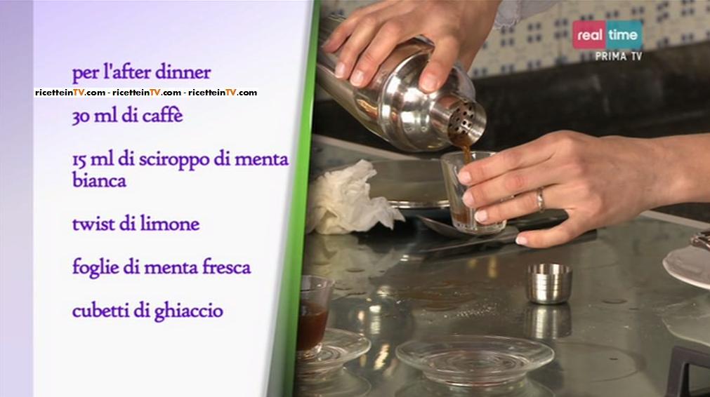 Per l’after dinner alla menta, prepariamo un buon caffè. In uno shaker, mettiamo il ghiaccio, lo sciroppo di menta bianca ed il caffè. Shakeriamo e serviamo nelle tazzine, con qualche fogliolina di menta e la buccia di limone tagliata a julienne.