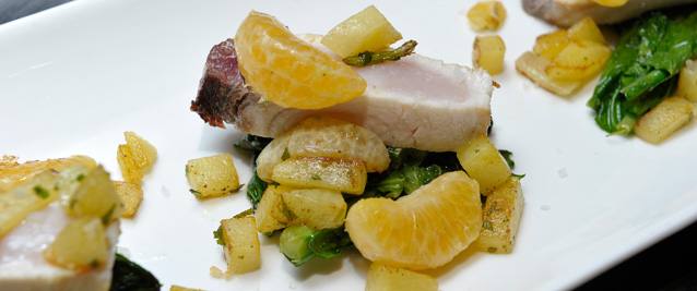 Procedimento: da un trancio di pesce spada ricavo dei bocconcini. Li rosolo in padella con un filo d’olio. Nel frattempo preparo i condimenti: taglio le patate a dadini e le salto in padella con olio e foglie di salvia tritate. Insaporisco con sale e pepe, poi aggiungo spicchi di mandarini. In un’altra padella con aglio e olio, faccio appassire i broccoletti con un po’ di acqua. Impiatto i bocconcini di pesce spada sulle foglie dei broccoli, con sopra le patate. Insaporisco con sale agli agrumi.