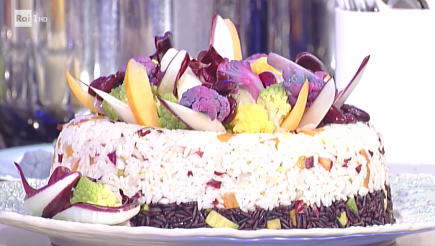 Al riso bianco uniamo del radicchio a pezzetti e del caco mela a cubetti piccoli (o della zucca a cubetti cotta a vapore). Al riso nero, invece, aggiungiamo dei cubetti di avocado conditi con succo di limone.