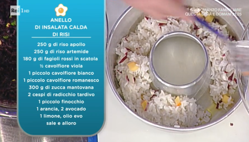 - 250 g riso Apollo, 250 g riso Artemide, 180 g fagioli rossi in scatola, mezzo cavolfiore viola, 1 cavolfiore piccolo bianco, 1 cavolfiore piccolo romanesco, 300 g zucca mantovana, 2 cespi di radicchio tardivo, 1 piccolo finocchio, 1 arancia, 2 avocado, 1 limone, olio evo, sale e alloro