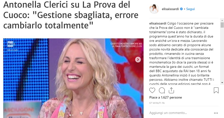 Aggiornamento ore 21:00 – Elisa Isoardi replica alle dichiarazioni di Antonella Clerici su Instagram: