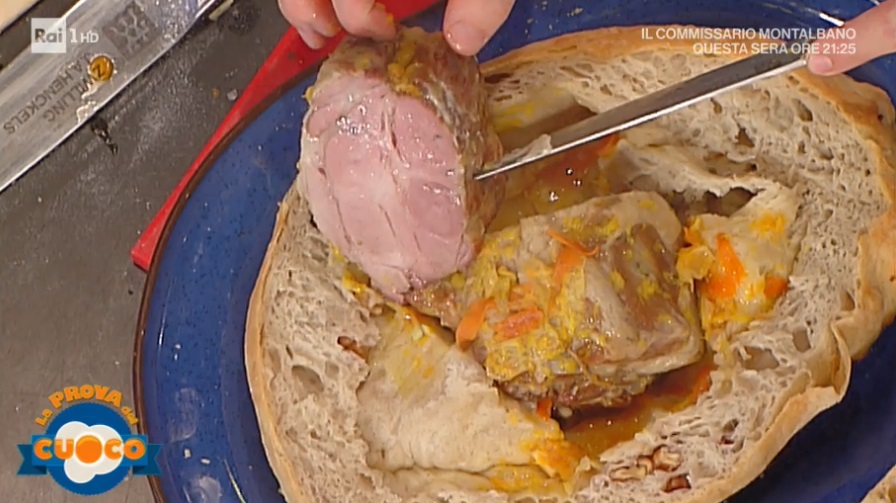 Per la crosta, mescoliamo rapidamente la farina con l’acqua, quindi uniamo il lievito madre ed impastiamo. Quando l’impasto è formato, inseriamo il sale. A fine impasto, avvolgiamo il panetto in un canovaccio e lasciamo lievitare per circa 4 ore, o fino al raddoppio. Stendiamo quindi l’impasto con le mani su un piano infarinato. Incastoniamo le noci sgusciate sull’impasto, quindi posizioniamo al centro l’arrosto riposato e richiudiamo la pasta sull’arrosto. Cuociamo in forno preriscaldato a 180° per 1 ora e mezza.