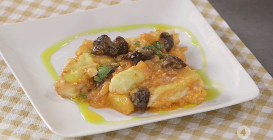 Infariniamo i trancetti di baccalà già ammollato con la semola di grano duro, quindi li facciamo rosolare in padella con un dito d’olio ben caldo. Lasciamo dorare su tutti i lati. Scoliamo su carta assorbente.