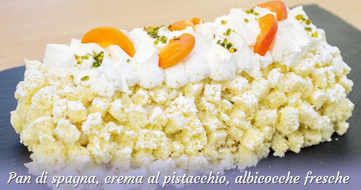 Ingredienti per il pan di spagna: 7 uova, 160 g farina 00, 160 g zucchero, 50 g fecola di patate, 50 g albicocche secche, 50 g burro a pomata per imburrare stampo, 100 g farina per stampo plumcake. Per la crema al pistacchio: 400 g latte intero, 100 g panna, 5 tuorli, 100 g zucchero, 20 g amido di riso, 20 g amido di mais, 50 g pasta di pistacchio, 50 g granella di pistacchio. Per la bagna all’albicocca: 200 g acqua, 60 g zucchero, 60 g liquore al albicocca. Per decorare: 200 g di albicocche fresche, 500 g panna, 40 g granella di pistacchio, 50 g di zucchero a velo.
