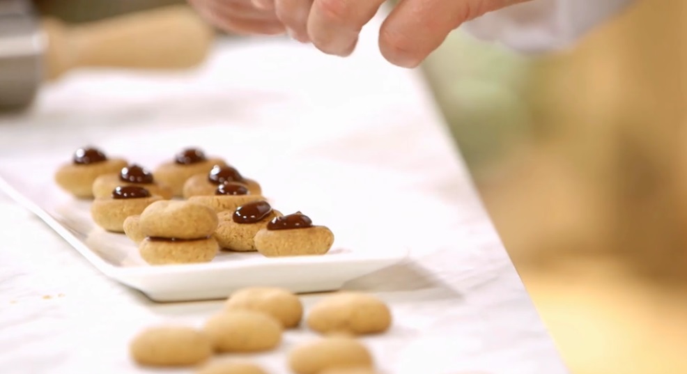 Prendiamo i biscotti freddi. Li accoppiamo, a 2 a 2, con un ciuffo di ganache. Lasciamo raffreddare 10 minuti in frigorifero.