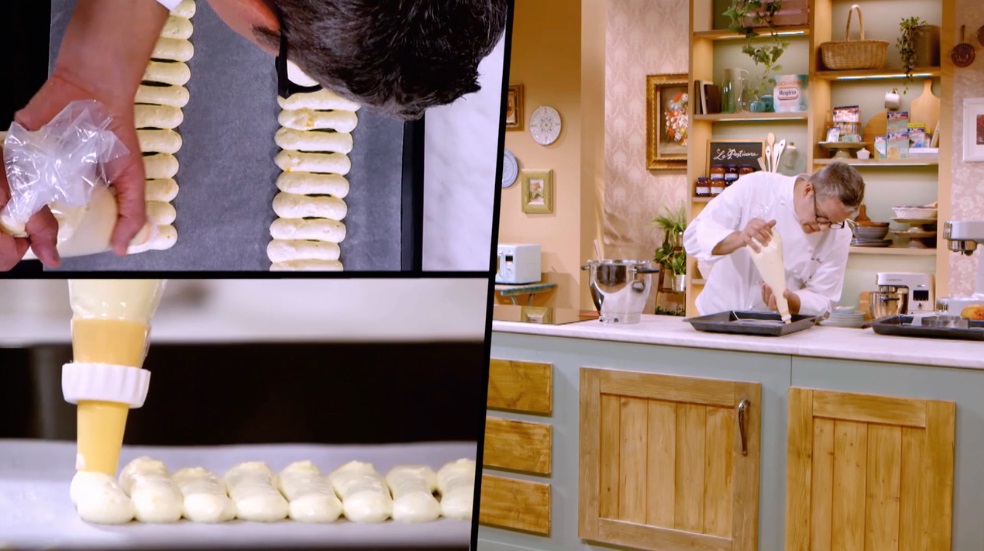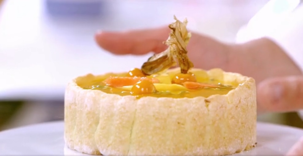- Bavarese esotica: 75 g latte, 125 g mango fresco, 225 g frutto della passione, 25 g zucchero, 60 g tuorlo, 10 g gelatina, 200 g cioccolato bianco, 600 g panna
