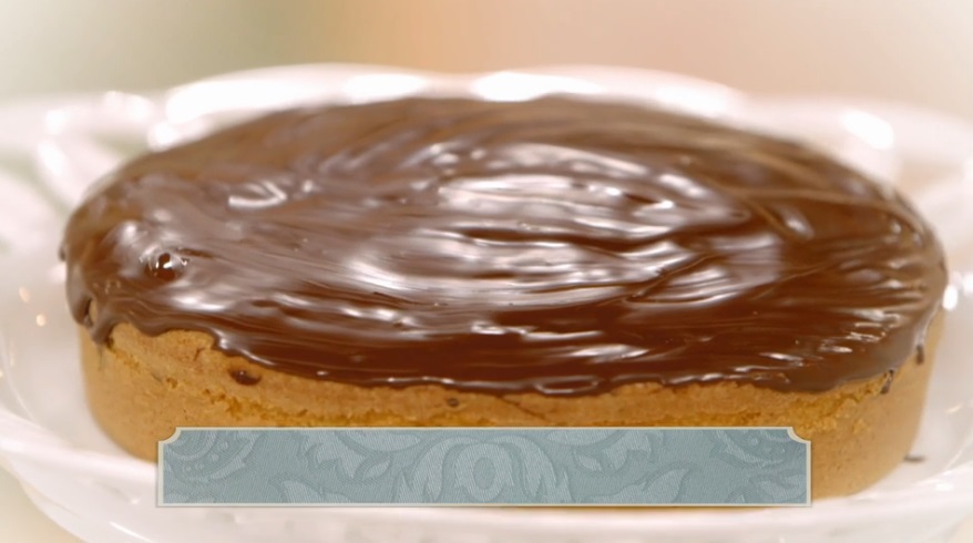 Sforniamo la torta e, quando è tiepida, spennelliamo con cioccolato fondente fuso.
