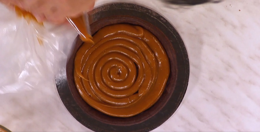 Farciamo il fondo della nostra frolla con uno strato di mou salato di mezzo cm circa, utilizzando la sac a poche. Versiamo sopra la ganache ancora calda (un altro mezzo cm). Mettiamo in frigorifero a raffreddare e decoriamo a piacere.