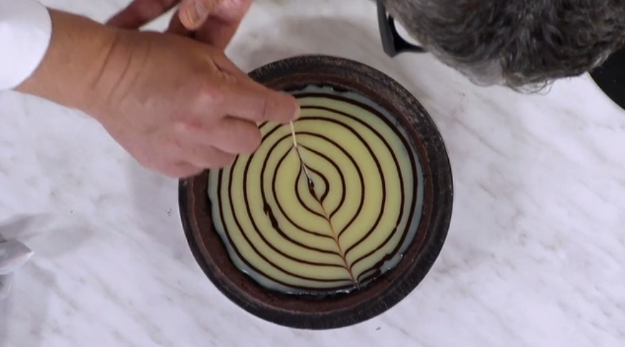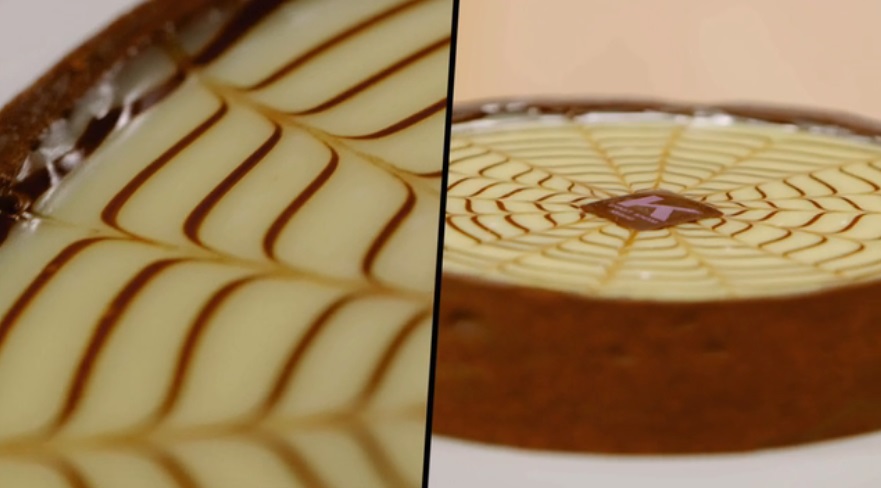 Versiamo la ganache al cioccolato bianco sulla torta. Riempiamo un conetto di carta con la ganache al cioccolato fondente e tracciamo il disegno decorativo sulla torta.