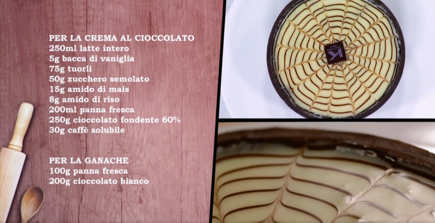 - Crema al cioccolato: 250 ml latte intero, 5 g bacca di vaniglia, 75 g tuorli, 50 g zucchero semolato, 15 g amido di mais, 8 g amido di riso, 200 ml panna fresca, 250 g cioccolato fondente 60%, 30 g caffè solubile