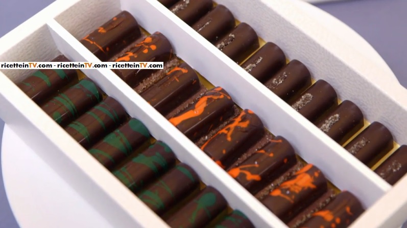 - Per i cioccolatini all’arancia amara: 50 g di burro di cacao, colorante arancione qb, 60 g di zucchero, 20 g di destrosio, 30 g di glucosio, 20 g di sorbitolo, 200 g di purea di arancia amara frullata, 30 g di Mycryo, 40 g di burro chiarificato, 250 g di cioccolato bianco, 30 g di scorza di arancia amara. Per il sablè cioccolato e sale: 205 g di burro demì sel, 160 g di zucchero di canna, 75 g di zucchero semolato, 1 bacca di vaniglia, 205 g di cioccolato fondente 70% a scaglie sottili, 45 g di cacao, 10 g di bicarbonato, 270 g di farina debole, 5 g di fleur de sel, 50 g di gelatina neutra