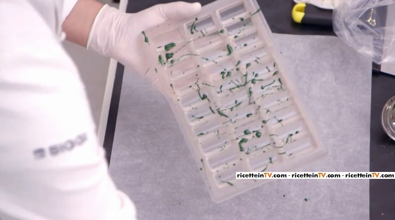Per la camicia: temperiamo 50 gr di burro di cacao, portandolo ad una temperatura di 30 gradi, in modo che si fonda. Aggiungiamo il colorante verde e mescoliamo. Con le dita di una mano, creiamo degli schizzi di colore su uno stampo per cioccolatini. Sarà questo l’effetto Pollock. Riempiamo una sac a poche con il cioccolato temperato e lo coliamo nello stampo per realizzare la camicia. Dopo un paio di minuti, coliamo via l’eccesso.