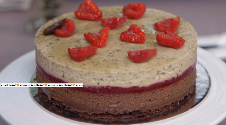 Stratifichiamo il dolce. Mettiamo alla base la marquise. Continuiamo con uno strato di ganache al cioccolato, poi mousse al cioccolato, croccante, ancora mousse al cioccolato, gelatina di lamponi, marquise e, infine, crema di melanzane. Congeliamo la torta. Lucidiamo con la gelatina neutra. Decoriamo con lamponi tagliati a metà.