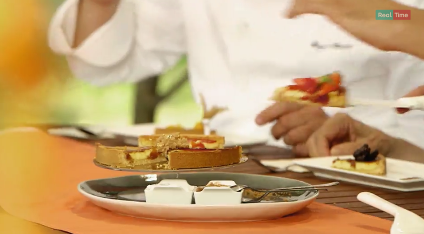 Pasta frolla: tagliamo il burro a cubetti e lo mettiamo nella planetaria con lo zucchero a velo, con la farina, i tuorli d’uovo e la vaniglia. Lavoriamo il tutto qualche minuto fino a ottenere un impasto liscio ed omogeneo e lasciamo riposare in abbattitore per 5 minuti. Stendiamo il composto di 4 mm e lo inseriamo in uno stampo microforato da 19 cm precedentemente imburrato. Inforniamo per 3 minuti a 165 gradi in forno ventilato.