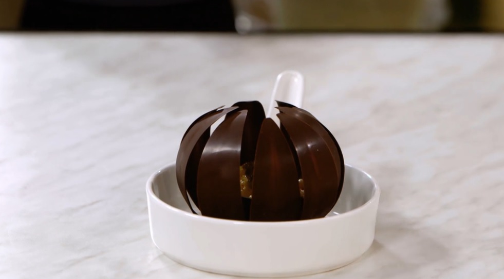 Posizioniamo il dolce sul piatto e al momento di servirlo versiamo all’interno del piatto la salsa inglese calda: il fiore si aprirà e schiuderà il dolce ripieno.