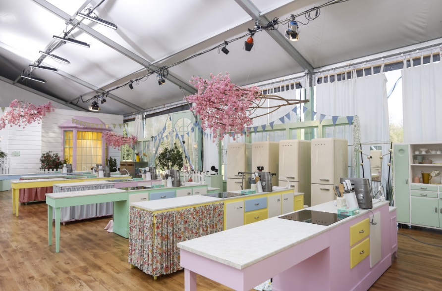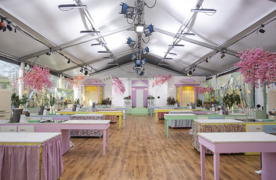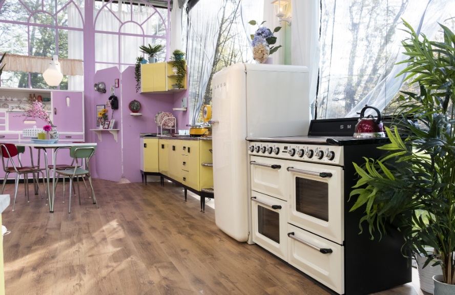 Il nuovo set, infatti, quest’anno è immerso negli anni ’50, in una atmosfera vivace, spensierata, dai colori accesi: rosa, verde, fucsia e giallo. L’iconico tendone del programma si trasforma in un allegra cittadina americana, ispirata al film Pleasantville del 1998, dove tutto è ordinato, le facciate delle case sono rivestite di doghe in legno bianco, i bow-window con le tende colorate e il giardino con il prato all’inglese recintato dalle staccionate. L’ingresso dei giudici è il viottolo di un parco con panchine in ferro bianco e lampioni. I rami di ciliegio in fiore colorano il tendone di rosa. L’angolo dei giudici è diventato una vera e propria cucina casalinga anni ‘50, gialla, dove si respira familiarità e profumo di ciambellone. Anche i banconi sono stati ripensati come se fossero delle cucine, con tendine colorate e ante e cassetti che ricordano i mobili dispensa di quegli anni. Il mobile radio, un must in tutte le case americane, rappresenta la musica, fondamentale nella vita di tutti. Un mondo familiare, ordinato e sereno con la perfetta colonna sonora.