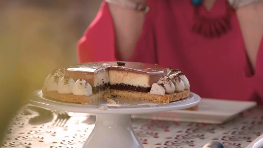 Glassiamo il mascarpone cake e lasciamo in frigorifero fino all’uso. Spalmiamo 1 mm di ganache al cioccolato al centro del Breton. Appoggiamo sopra il disco di marquise e la bagniamo con la bagna al caffè. Appoggiamo sopra il mascarpone cake glassato. Con l’aiuto di una sac a poche, decoriamo i bordi esterni della torta con ciuffi di ganache al caffè montata. Decoriamo con foglia oro e spolverata di caffè in polvere sugli spuntoni.