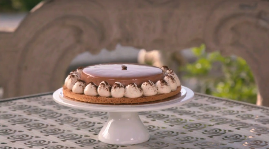 Ganache al caffè montata: lasciamo in infusione per 24 ore la panna 1 con i chicchi di caffè. Filtriamo la panna e la scaldiamo con glucosio e trimolina a 55 °C. Sciogliamo il cioccolato a 45 °C e frulliamo il tutto con un mixer ad immersione. Uniamo al composto anche la panna 2. Mettiamo in frigorifero per 60 minuti circa. Montiamo ed utilizziamo dopo averla inserita in una sac a poche.