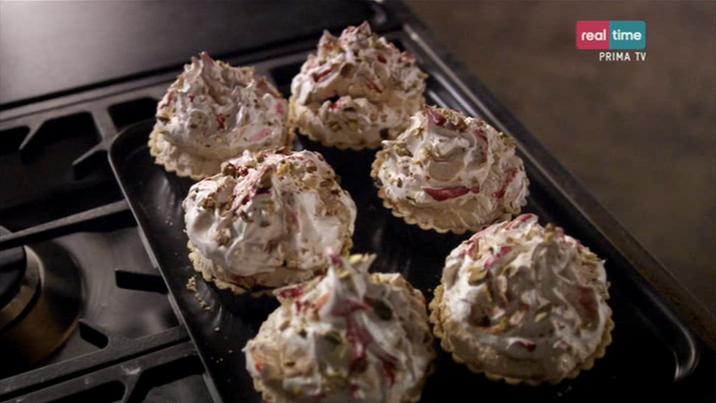 Dividiamo il composto di ciliegie nei gusci di frolla; copriamo con della meringa e spolveriamo con granella di pistacchi. Inforniamo 45 minuti a 110°.