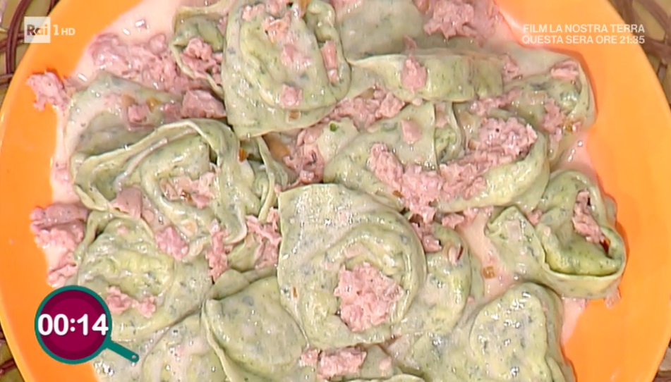 Prepariamo la pasta all’uovo lavorando la farina con le uova e gli spinaci scottati, strizzati e tritati finemente al coltello. Profumiamo l’impasto con una spolverata di noce moscata e lavoriamo fino ad ottenere un panetto liscio. Avvolgiamo nella pellicola e lasciamo riposare per mezz’ora. Tiriamo la sfoglia non troppo sottile.