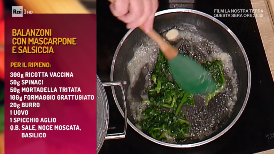 Ripieno: scottiamo gli spinaci, quindi li ripassiamo in padella con una noce di burro ed uno spicchio d’aglio. Li lasciamo intiepidire. In una ciotola, quindi, mettiamo la ricotta, gli spinaci saltati e tritati al coltello, la mortadella tritata finemente, il formaggio grattugiato, l’uovo, sale e noce moscata. Mescoliamo per bene.