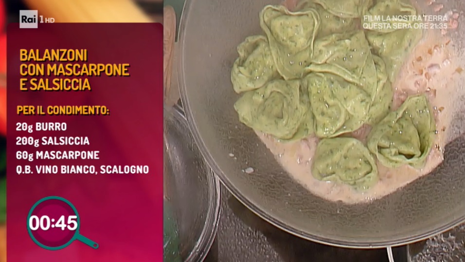 Condimento: in padella, facciamo rosolare la salsiccia sgranata con il burro e lo scalogno tritato. Sfumiamo con il vino bianco, quindi uniamo il mascarpone. Saltiamo i balanzoni con il condimento per qualche istante.