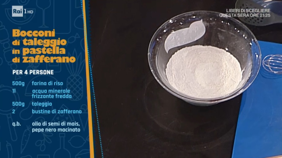 • 500 g farina di riso, 1 l acqua frizzante fredda, 500 g taleggio, 2 bustine di zafferano, olio di semi, pepe nero