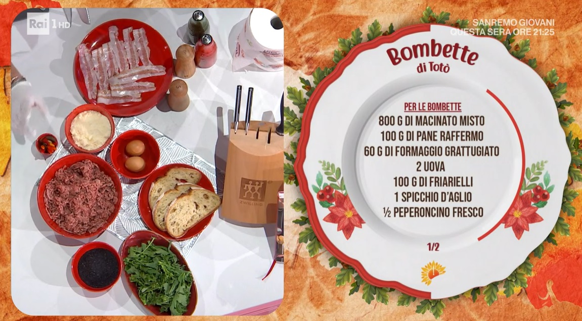 In una ciotola, mettiamo il macinato di carne, il pane raffermo ammollato con latte o acqua e strizzato, le uova, il formaggio grattugiato e lavoriamo fino ad ottenere un composto omogeneo. Dividiamo l’impasto in 4 parti da circa 250 g. Con i 4 panetti, formiamo delle sfere, creiamo un incavo al centro ed inseriamo all’interno i friarielli ripassati. Richiudiamo la carne sul ripieno e diamo una forma conica (come un’arancina appuntita). Disponiamo le bombette su una teglia con carta forno e ne avvolgiamo i lati con delle fette di guanciale. ‘Intingiamo’ la punta della bombetta nei semi di sesamo nero. Cuociamo in forno caldo e statico a 200° per 15 minuti.