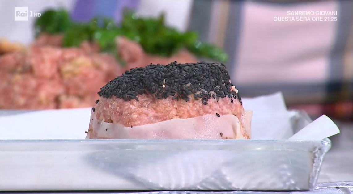 - 800 g macinato misto, 100 g pane raffermo, 60 g formaggio grattugiato, 2 uova, 100 g friarielli, 1 spicchio d’aglio, mezzo peperoncino, 50 g semi di sesamo nero, 8 fette di guanciale, olio evo, sale e pepe