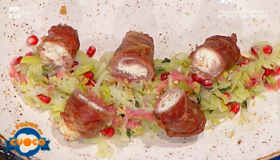 Serviamo gli involtini su un letto di porri ed irroriamo con la salsa alla melagrana.