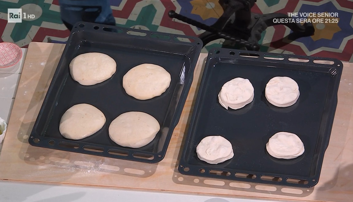 Stendiamo l’impasto sul piano infarinato, con le mani, ad uno spessore di 2 cm circa. Ricaviamo dei dischi con un coppapasta da 8-10 cm (saranno pesanti circa 80 g). Li disponiamo su una teglia, li copriamo e lasciamo lievitare 2 ore a temperatura ambiente.