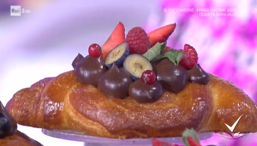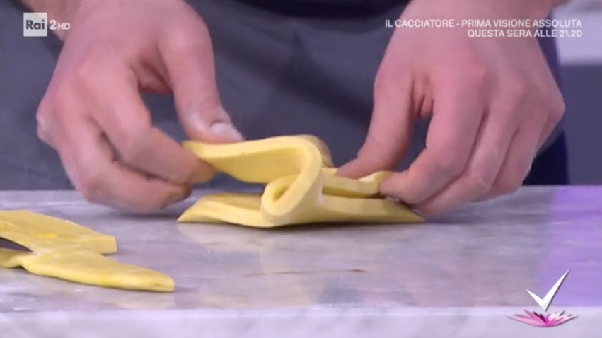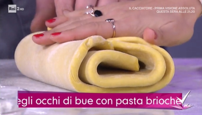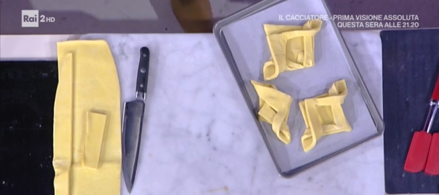A questo punto stendiamo la pasta sfoglia all’altezza di 1 cm. Ritagliamo dei quadrati. Pieghiamo ciascun quadrato in 2, in modo da ottenere una triangolo. Incidiamo ad 1 cm dal bordo, lungo i lati. Intrecciamo i due lembi ottenuti (foto). Disponiamo su una teglia, copriamo e facciamo lievitare 2 ore. Spennelliamo con uovo sbattuto con un po’ di latte ed inforniamo a 180° per 15 minuti.