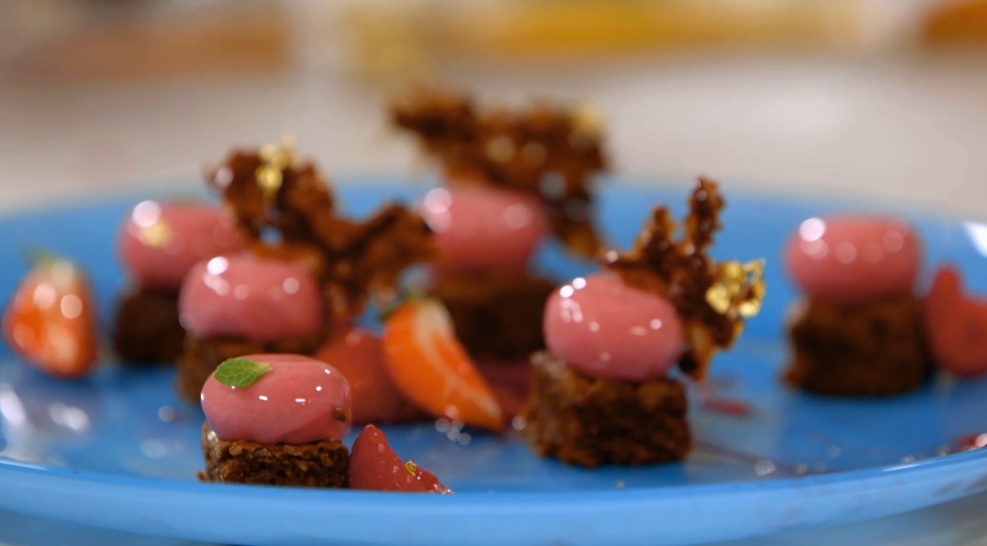 Tagliamo i brownies freddi in quadratini di 3×3 cm. Collochiamo sopra la mezza sfera di cremoso alla fragola. Decoriamo con il croccante, 1/4 di fragola e alcuni frammenti del foglio oro.