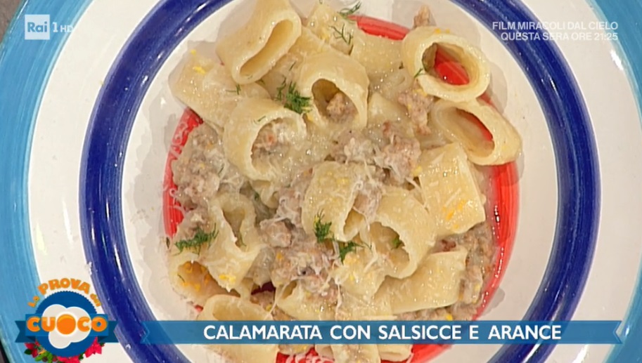 - 280 g pasta calamarata, 250 g salsiccia fresca macinata grossa, mezzo bicchiere di vino bianco, 250 g finocchi, 1 arancia, 50 g pecorino grattugiato, sale, succo di limone, finocchietto fresco