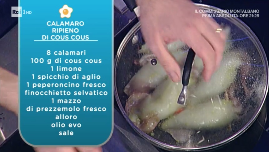 calamaro ripieno di cous cous di Sergio BarzettiLa Sicilia imperversa nelle cucine de La prova del cuoco. Dopo la pasta di Alessandra, il secondo a base di cous cous e pesce di Sergio Barzetti. Ecco il calamaro ripieno di cous cous.
