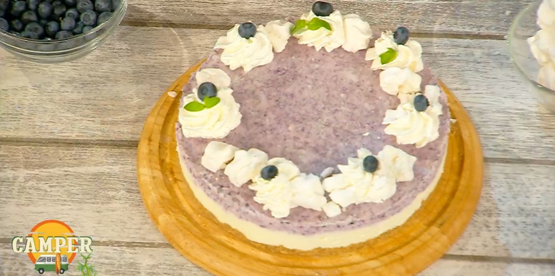 Versiamo la crema bianca sulla base di biscotti, quindi versiamo sopra la crema ai mirtilli. Livelliamo e lasciamo riposare in frigorifero per una notte. La sformiamo e la decoriamo a piacere