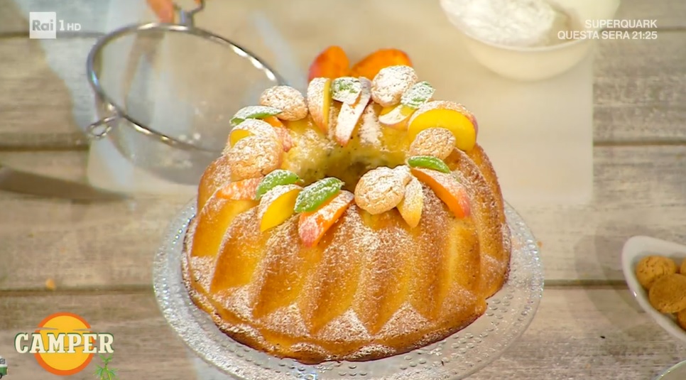 Passiamo all’impasto. Con le fruste elettriche, montiamo le uova intere insieme allo zucchero, per circa 5 minuti: dobbiamo ottenere un composto chiaro e spumoso. Aggiungiamo l’olio d’oliva e mescoliamo ancora. Profumiamo con la scorza grattugiata del limone ed il suo succo. Aggiungiamo la farina di mandorle e mescoliamo con una spatola, fino ad ottenere un impasto omogeneo. Incorporiamo la farina setacciata insieme al lievito per dolci. Mescoliamo per bene ed aggiungiamo all’impasto gli amaretti sbriciolati con le mani e le albicocche a pezzettoni. Distribuiamo l’impasto all’interno di uno stampo per ciambellone e disponiamo sopra le cucchiaiate di confettura di pesche congelate, premendo leggermente. Cuociamo in forno caldo e statico a 180° per circa 45 minuti.