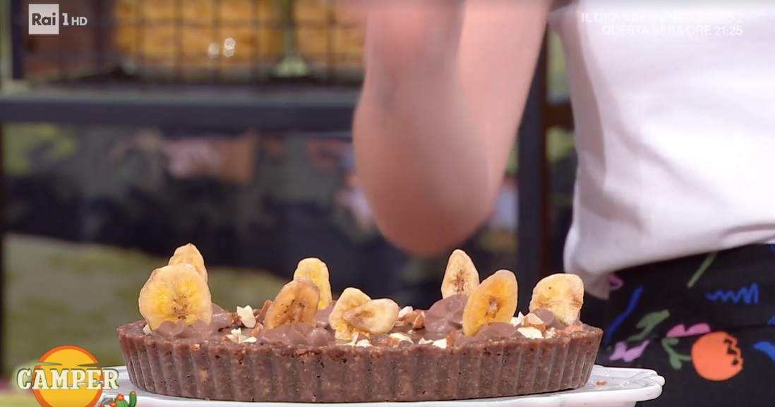 Sbucciamo la banana e la tagliamo a rondelle. La disponiamo sulla base di biscotti.