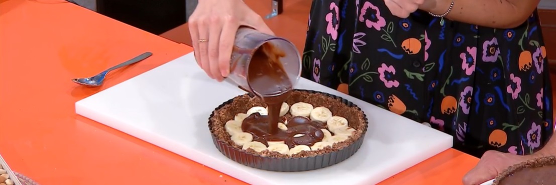 Coliamo la crema ancora calda sulla base di biscotti e banane. La livelliamo e la mettiamo a riposare in frigorifero.