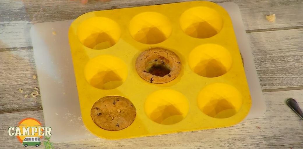 Lavoriamo il burro morbido con lo zucchero di canna (o bianco), usando semplicemente un cucchiaio. Aggiungiamo l’uovo e lavoriamo ancora. A questo punto, incorporiamo il bicarbonato, la fecola di patate, la farina 00 e lavoriamo fino ad ottenere un impasto omogeneo. Aggiungiamo le gocce di cioccolato e lavoriamo fino a distribuirle al meglio. A questo punto, possiamo preparare dei biscotti, oppure prendiamo uno stampo da muffin in silicone e inseriamo in ogni incavo circa 40 g di impasto, schiacciando sul fondo e sui lati, in modo da creare come dei nidi. Cuociamo in forno caldo e statico a 180° per 10-12 minuti. Appena sfornati, quando sono ancora caldi, con un bicchierino o un altro arnese, pressiamo al centro di ogni biscotto e facciamo raffreddare (foto).