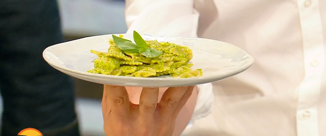 Prepariamo il pesto: sbollentiamo per 10 secondi il basilico (per mantenere il verde; possiamo evitarlo) in acqua bollente, lo scoliamo, lo strizziamo con la carta assorbente, in modo da asciugarlo per bene.