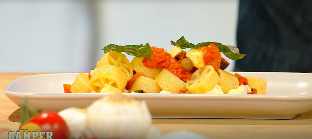 - 400 g ruote di grano duro, 250 g pomodori ciliegini o datterini, 200 g mozzarella di Bufala, 4 cucchiai di olive taggiasche, olio evo, sale, 2 spicchi d’aglio, 3 g zucchero, 3 g sale, basilico, mentuccia, 100 g pecorino romano (facoltativo)
