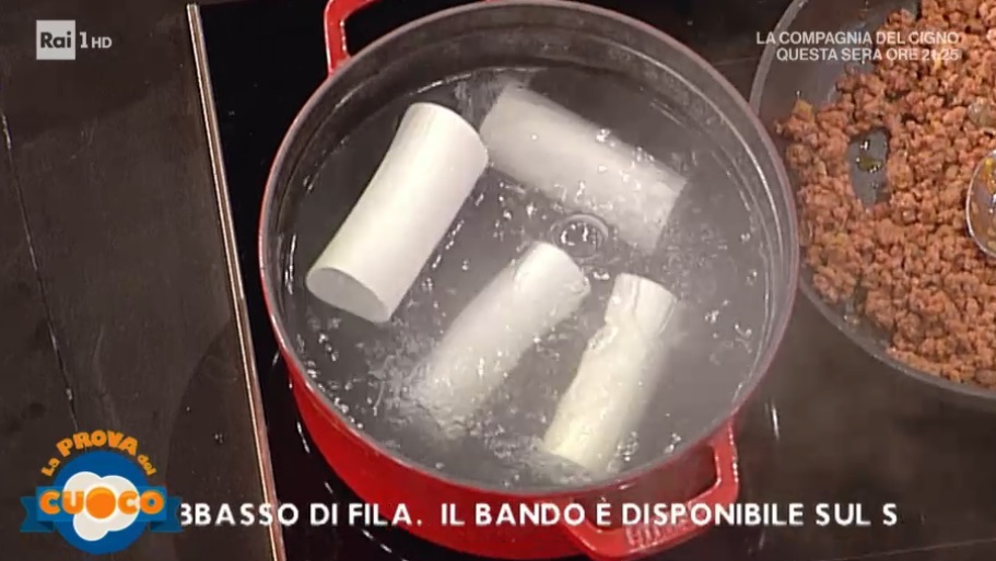 Prendiamo i porri, eliminiamo la parte verde e la radice. Ricaviamo quindi dei cannelloni di 10-15 cm di lunghezza. Basterà tagliare la base ad un’altezza di 15 cm, quindi li ‘sfogliamo’. Sbollentiamo i cannelloni ottenuti in acqua salata per circa 2 minuti. Scoliamo e passiamo in acqua fredda.